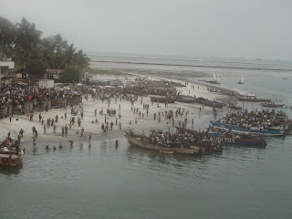 guided across the flat (low tide) beach to climb into the dhows. With the help
